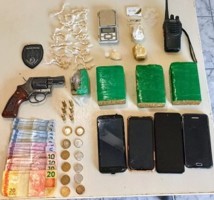 Já na residência dos abordados foram encontradas quatro porções de maconha em cima de uma mesa. Foram encontradas ainda outras porções da droga, 156 pedras de crack, quatro tabletes grandes de maconha, uma munição calibre 38, dois aparelhos celulares, um rádio comunicador, uma balança de precisão, uma lâmina, alguns receptáculos vazios e R$ 91,50 espécie.