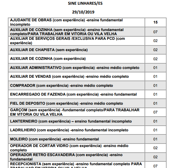 O SINE de Linhares devido ao dia do servidor publico irá funcionar a partir desta terça-feira (29/10), e está com 56 oportunidades de vagas para trabalho, dessa 56, apenas 03 funções, não exige experiência, que é para auxiliar de Chapista, Auxiliar de Cozinha e Garçom, as duas última é para aguar nos municípios de Vitoria ou Vila Velha. Há chances para todos os níveis de escolaridade. Confira as vagas no quadro abaixo. O SINE funciona das 8 às 17 horas e os telefones de contato são os 27 3372 2131 e 3372 3230.