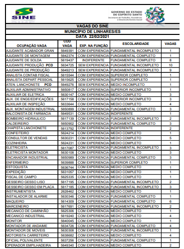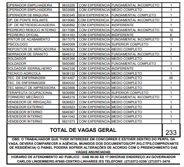 A semana começa com 233 vagas de trabalho oferecidas através do Sine de Linhares. A maioria delas pede experiência.
