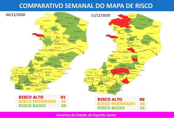 O Governo do Estado anunciou, nesta sexta-feira (11/12), o 35º Mapa de Risco Covid-19, que terá vigência entre a próxima segunda-feira (14/12) e o domingo (20). Dos 78 municípios capixabas, 24 estão classificados em Risco Baixo e 48 estão em Risco Moderado. Outros seis municípios (Anchieta, Domingos Martins, Ecoporanga, Ibiraçu, Mantenópolis e Marilândia) estão classificados como Risco Alto.