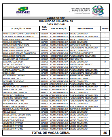 85 VAGAS – Confira as vagas de trabalho do SINE de Linhares