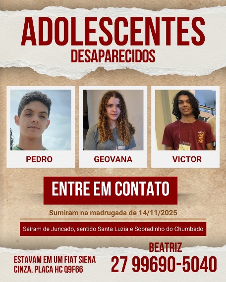 Segundo informações repassadas por familiares, os jovens deixaram o local em um Siena cinza, ano 2007/2008, placa HCQ9F66, e foram vistos por sistemas de monitoramento trafegando por João Neiva, por volta das 4h da manhã, e em Fundão, às 5h. A suspeita é de que estejam seguindo em direção à Grande Vitória.
