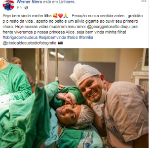 Sua esposa, Georggia Tossato Custódio, deu à luz a bela Alice, por volta das 18h, no Hospital Rio Doce, em Linhares.