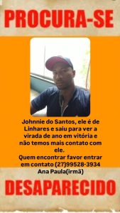 Segundo informações divulgadas em um cartaz compartilhado por familiares, Johnnie saiu de Linhares com destino à região metropolitana, porém não retornou e não deu mais notícias, o que tem causado grande preocupação entre parentes e amigos.