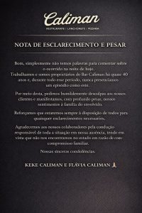 Restaurante, lanchonete e Pizzaria Caliman divulga nota de esclarecimento e pesar