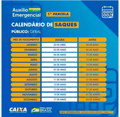 A partir desta terça-feira (04/05), beneficiários do Auxílio Emergencial 2021 nascidos em março podem sacar ou transferir os recursos da 1ª parcela que foram creditados na Poupança Social Digital. O calendário de saque foi antecipado. Antes, a data para retirada estava prevista para o dia 10 de maio. Recursos ainda podem ser movimentados pelo aplicativo CAIXA Tem e na Rede Lotérica de todo o país.