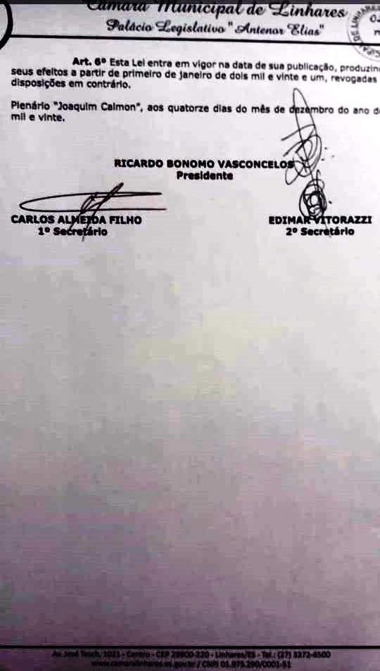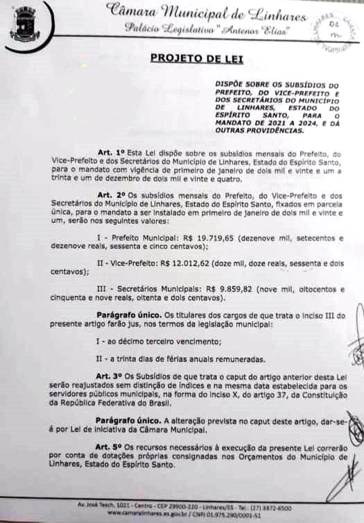 Já imaginou se em meio a uma pandemia você recebesse um robusto aumento em seu salario de R$ 1.399,00? Pois é isso deve ocorrer na noite desta segunda-feira (21/12), na Câmara de Vereadores de Linhares, durante a sessão ordinária, que começa às 18 horas. Um projeto da mesa diretora da casa já protocolou o projeto que trata do aumento de salários do Prefeito, que atualmente é de, R$ 18.320,00 e sendo aprovado passara para, R$, 19.719,65 um aumento de R$ 1.399,65. O salario do vice-prefeito, sendo aprovado passará de R$ 11.160,00, para 12.012,62 um aumento de R$ 852,62, já os salários dos secretários saltariam de R$ 9.160 para R$ 9.859,82 um aumento de R$ 699,82. Sendo aprovado o aumento será de 7,5% e começará a valer em 1º de Janeiro de 2021
