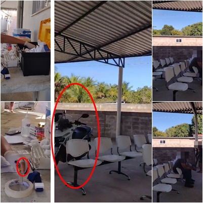 No vídeo, é possível ver pacientes aguardando e sendo atendidos no mesmo espaço, sem qualquer privacidade, enquanto outros observam a coleta de sangue sendo feita. Em determinado momento, é possível notar que um dos profissionais realiza o procedimento com um dos dedos fora da luva, tocando os tubos de sangue — o que pode gerar riscos de contaminação tanto para o profissional quanto para os pacientes e pasmem o espaço é dividido com uma motocicleta estacionada no mesmo local. Vejam fotos abaixo.