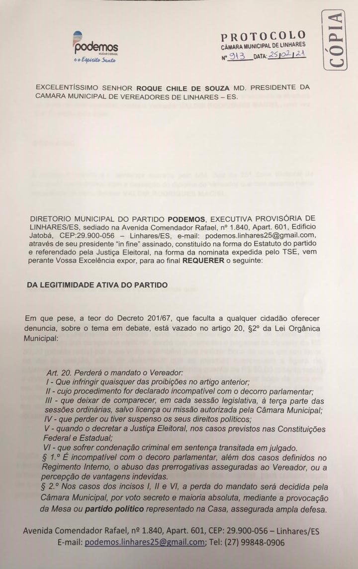 Na manhã desta quinta-feira, 25 de fevereiro, o Partido PODEMOS, que é do vereador denunciado, protocolou na Câmara de vereadores de Linhares, o pedido de instauração da Comissão processante e também o afastamento do parlamentar, durante as investigações.