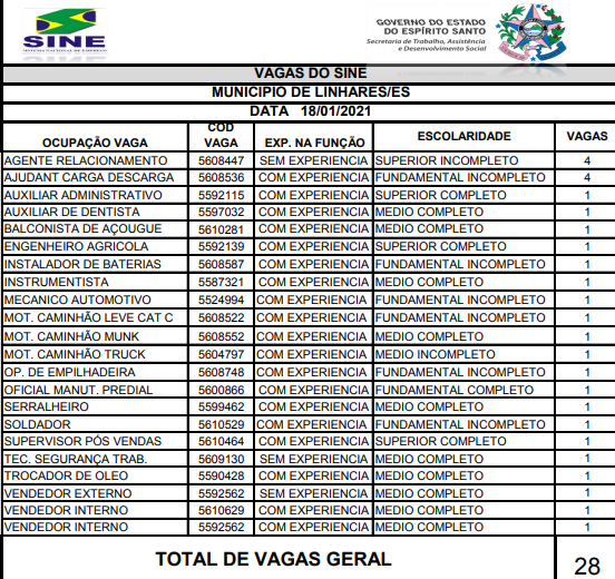 A segunda-feira (18/01) começa com 28 vagas de trabalho oferecidas através do Sine de Linhares. Apenas 3 delas não pede experiência.