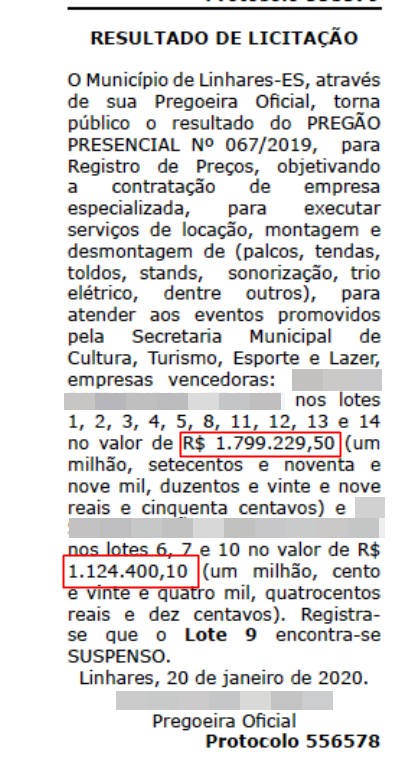 Nossa reportagem procurou junto ao setor de comunicação da Prefeitura de Linhares saber em quais e em quantos eventos as empresas irão prestar os seus serviços e em qual período. Em nota, a prefeitura apenas disse que, todos os contratos da Prefeitura são publicados no Portal da Transparência. Veja nota: