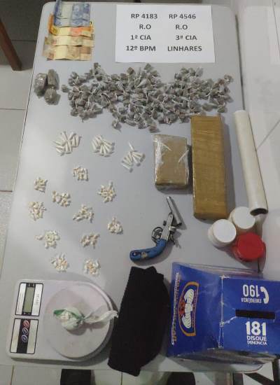 A guarnição abordou um suspeito que estava no local e com ele foi encontrado, durante a busca pessoal no seu bolso, o valor de R$ 120 e no outro bolso a quantia de 13 pedras de crack, os militares também realizaram buscas na casa e nas imediações onde foi encontrado 1 kg e 51gramas de maconha, 100 pedras de crack embaladas para comercialização, 152 buchas de maconha, também embaladas para comercialização, 27 pinos de cocaína, 25 buchas grandes e mais de 25 gramas de cocaína, 3 buchas grandes de maconha, na gaveta de um móvel havia uma garrucha calibre 22, de fabricação industrial e no quintal da residência foi encontrada a motocicleta, que foi roubada no domingo (28/02).