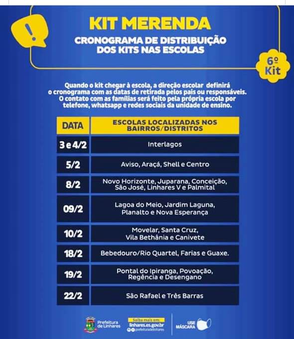 “O 6º kit merenda começa a ser entregue às escolas de Educação Infantil e Ensino Fundamental de Linhares nesta quarta-feira (3). A partir daí, a direção escolar definirá o cronograma com as datas e horários de retirada que serão informados aos pais ou responsáveis por telefone, WhatsApp e pelas redes sociais da unidade de ensino.