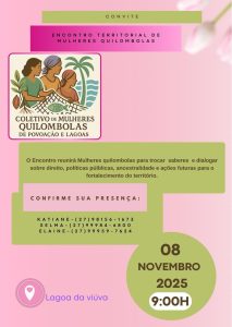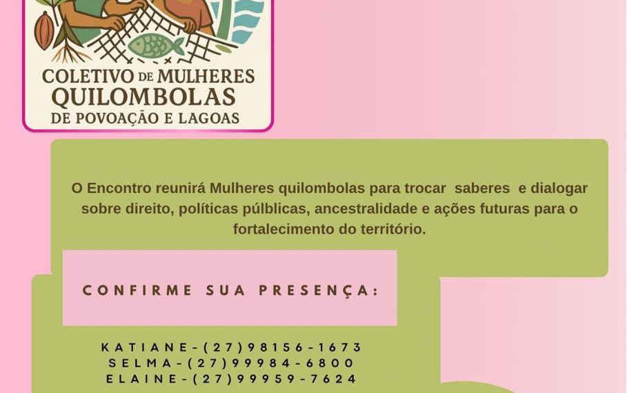 O Coletivo de Mulheres Quilombolas de Povoação e Lagoas promoverá no dia 8 de novembro de 2025, a partir das 9h, o Encontro Territorial de Mulheres Quilombolas, que será realizado na Lagoa da Viúva, em Linhares.