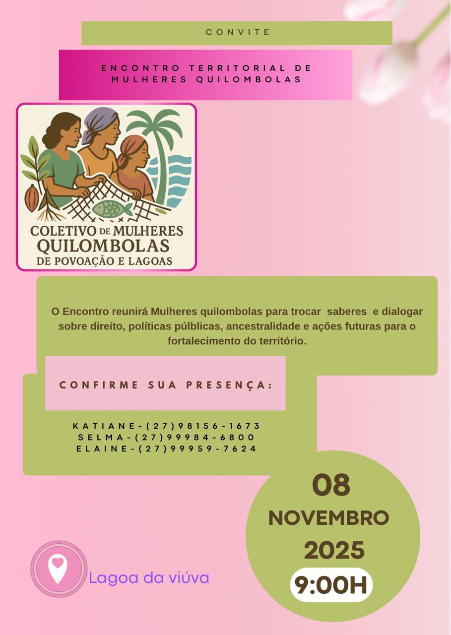 O Coletivo de Mulheres Quilombolas de Povoação e Lagoas promoverá no dia 8 de novembro de 2025, a partir das 9h, o Encontro Territorial de Mulheres Quilombolas, que será realizado na Lagoa da Viúva, em Linhares.
