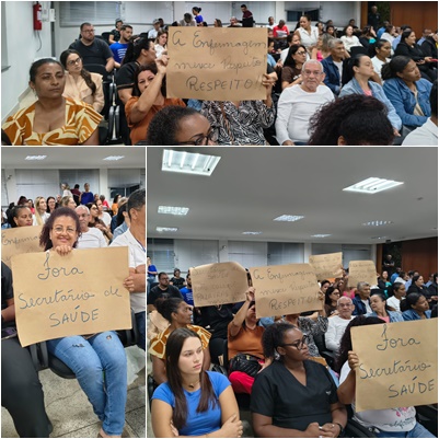 A notícia causou revolta e mobilizou novamente os profissionais da saúde, que compareceram em grande número à sessão, levando cartazes e reivindicando melhores condições.