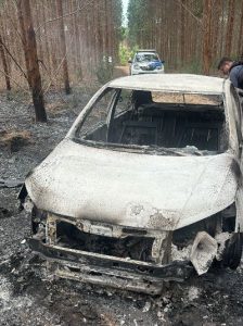 Pouco tempo após o homicídio, a guarnição recebeu uma nova informação repassada pelo Centro de Comunicação Operacional (CCO), dando conta de que, na região da Suzano, em uma área de plantação de eucaliptos, havia um veículo em chamas. No local, a brigada de incêndio da empresa já realizava o combate ao fogo.