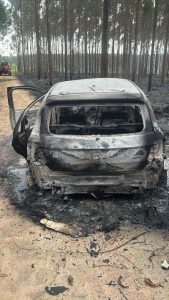 Pouco tempo após o homicídio, a guarnição recebeu uma nova informação repassada pelo Centro de Comunicação Operacional (CCO), dando conta de que, na região da Suzano, em uma área de plantação de eucaliptos, havia um veículo em chamas. No local, a brigada de incêndio da empresa já realizava o combate ao fogo.