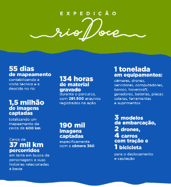 Durante a expedição, finalizada em janeiro deste ano, a equipe chegou a um total de 190 mil imagens captadas especificamente com uma câmera 360 graus. São essas imagens que compõem o percurso publicado no Google Street View. Além da captação no rio Doce, outra equipe produziu mini documentários e vídeos que registram personagens que têm suas vivências atreladas ao rio. Contabilizando a visita técnica e a descida no rio, foram percorridos de carro cerca de 37 mil quilômetros. Somando todo o material audiovisual, entre fotos e vídeos, foram 134 horas de captação, com 291.500 arquivos registrados na ação.