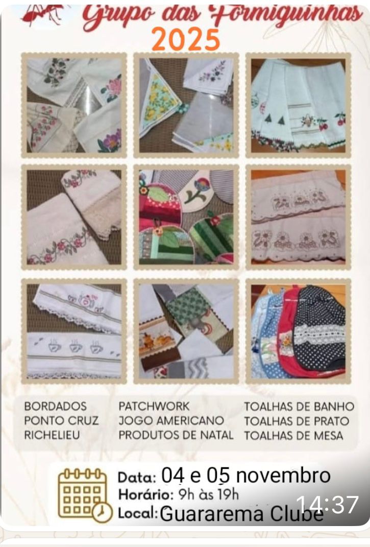 Então, anote na agenda: dias 4 e 5 de novembro, no Guararema Clube, das 9h às 19h. Venha prestigiar, apoiar o artesanato local e ajudar quem mais precisa!