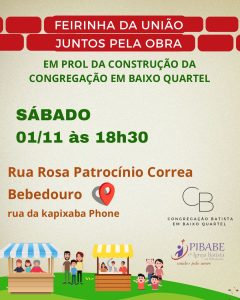 Organizada pela Primeira Igreja Batista em Bebedouro (PIBABE) e pela Congregação Batista em Baixo Quartel, a feirinha tem como objetivo arrecadar fundos para a construção do novo templo da congregação em Baixo Quartel.