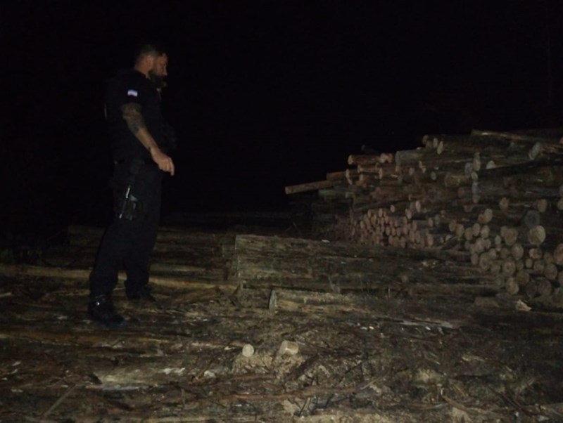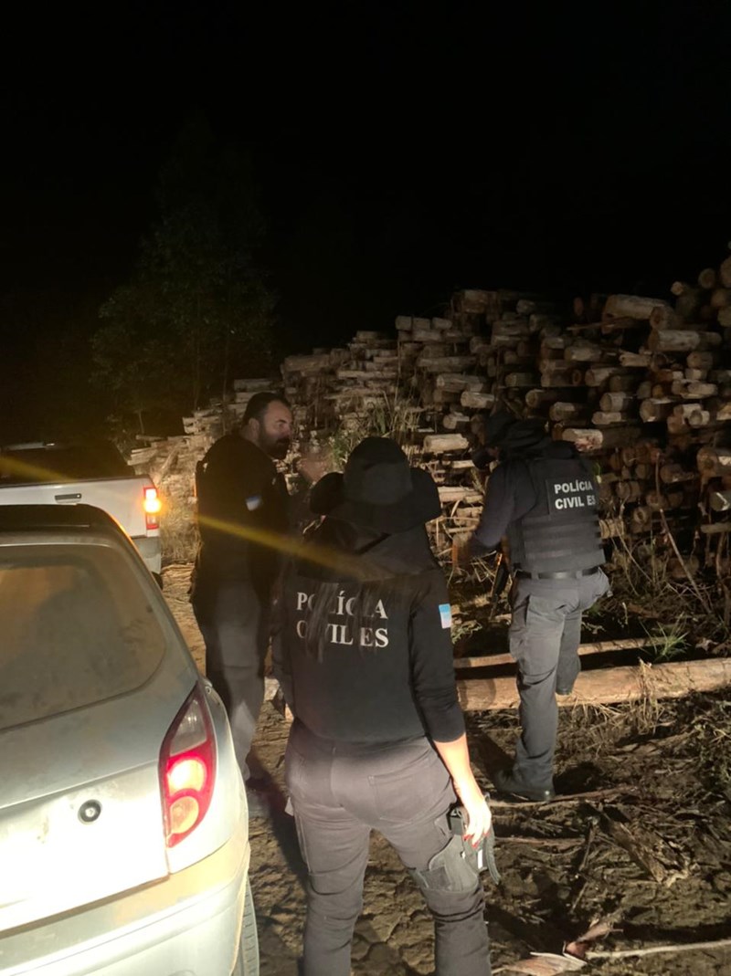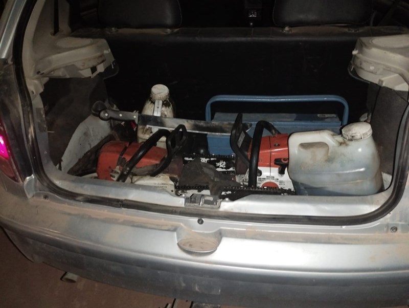 Os policiais realizaram a abordagem e, no porta-malas do carro, encontraram dois galões de gasolina e duas motosserras com o motor ainda quente. A equipe da Força Tarefa seguiu até as pilhas de madeiras de eucaliptos e constataram que vários metros cúbicos de eucalipto já tinham sido subtraídos e outro montante de madeira já estava serrado, também para ser subtraído.