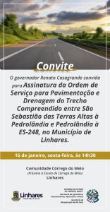 Será realizada nesta sexta-feira, 16 de janeiro, que o governador Renato Casagrande, assinará a Ordem de Serviço para a execução das obras de pavimentação e drenagem do trecho que liga São Sebastião das Terras Altas à comunidade de Pedrolândia, além do segmento que conecta Pedrolândia à rodovia ES-248, no município de Linhares, no Norte do Espírito Santo.