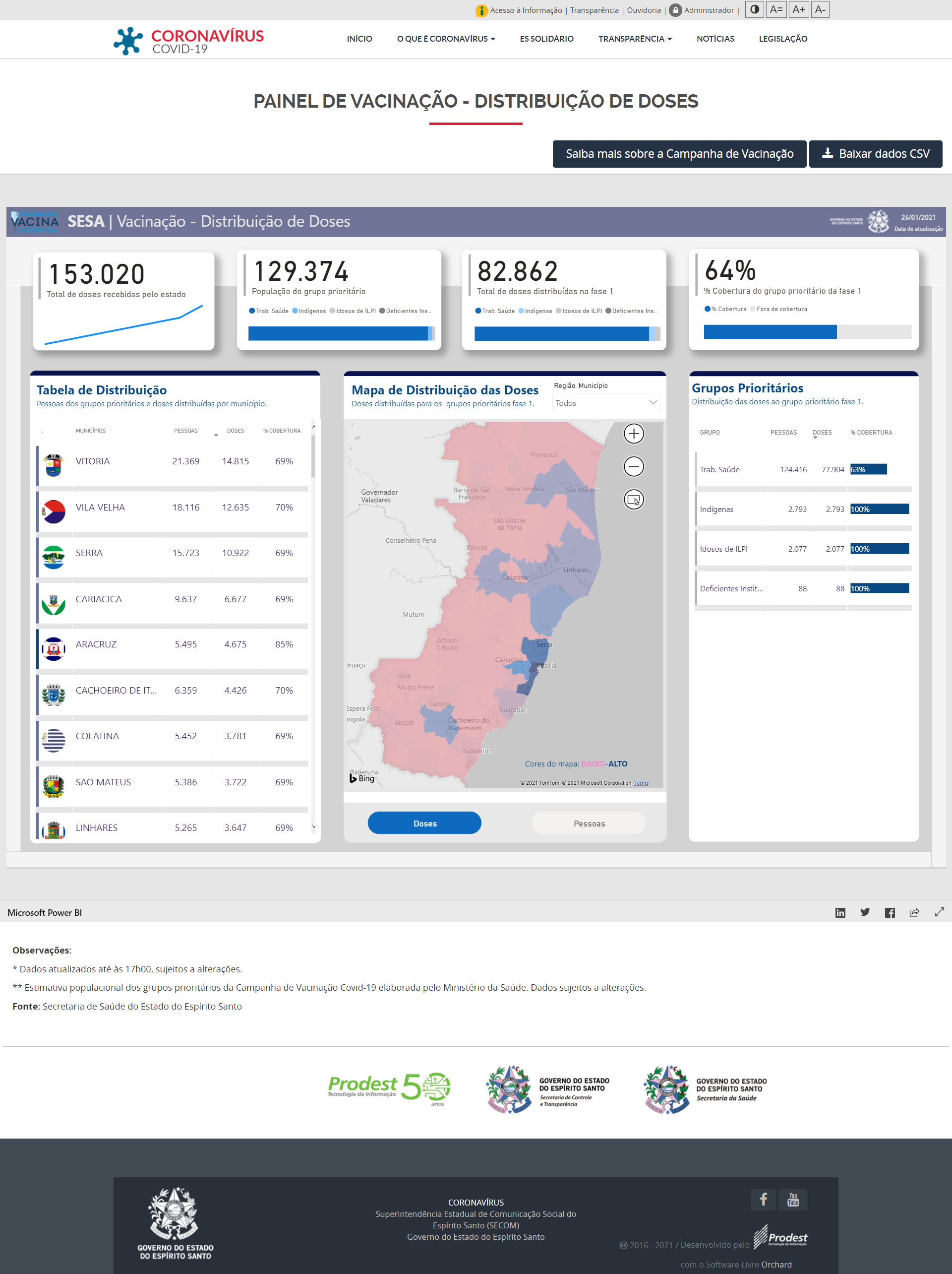 O Governo do Estado deu mais um passo para garantir a transparência nas informações sobre o novo Coronavírus (Covid-19): os dados sobre vacinas recebidas, distribuídas e aplicadas no Espírito Santo já estão disponíveis no site Coronavírus (www.coronavirus.es.gov.br). Além dos números atualizados diariamente, a página conta com um painel interativo com detalhes sobre a imunização, como o total de doses enviadas para cada município, a distribuição por grupo prioritário e o percentual de cobertura alcançado em cada grupo.