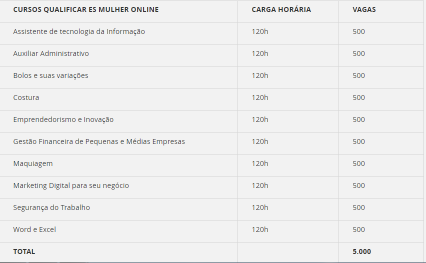 As mulheres vão poder escolher entre 10 opções de cursos e se inscrever em dois. As inscrições são realizadas no site do Qualificar ES (www.qualificar.es.gov.br). O edital de seleção com todas as informações já está disponível para acesso no site. Podem se inscrever mulheres que morem em qualquer lugar do Estado, que tenham mais de 16 anos e acesso à internet.