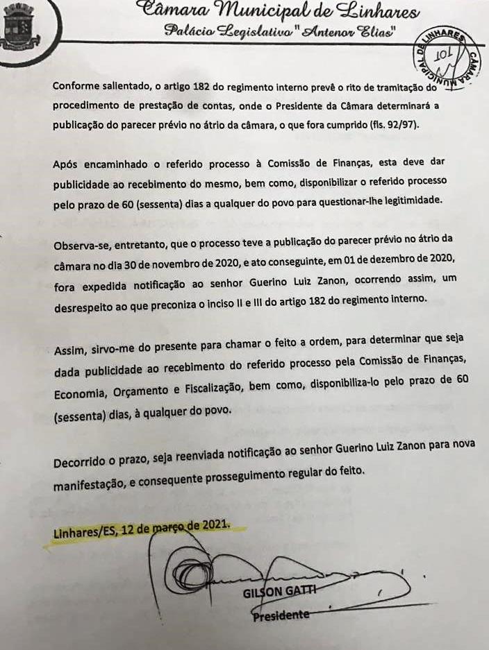 O procedimento tem o número 00427/2020 e, neste momento, está com a Comissão de Finanças, Economia, Orçamento, e Fiscalização que é presidida pelo vereador Gilson Gatti, que é do MDB, mesmo partido do prefeito Guerino Zanon.