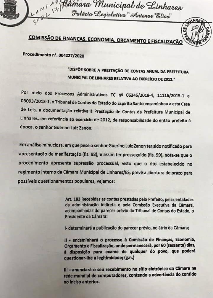 Desde a última sessão ordinária, já está aberto o prazo de 60 dias para análise do resultado de apuração das contas do exercício 2012 da Prefeitura de Linhares. De acordo com a manifestação do TCU, Tribunal de Contas da União, por causa de supostas irregularidades, é recomendada a aprovação com ressalvas. O prefeito na época era o atual gestor, Guerino Zanon.