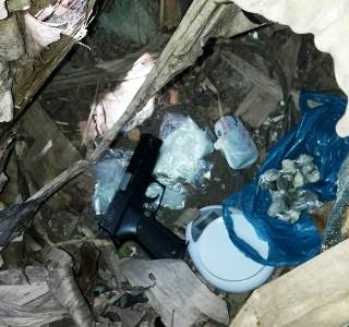 A senhora que estava na casa era a irmã do suspeito e foi pedido para que ela mostrasse o quarto de seu irmão, o que foi atendido por ela, foi realizadas buscas no quintal e nada de ilícito foi encontrado em sequência as buscas foram realizadas no valão, onde segundo a informação teria drogas escondidas, e nas proximidades da manilha  próximo as Bananeiras, debaixo de uma lona preta ,que estava escondida em baixo de uma bacia plástica preta foi encontrada uma sacola contendo aproximadamente trinta pedras de crack, trinta buchas de Maconha uma balança de precisão, um tablete pequeno de Maconha pesando aproximadamente cinquenta gramas e várias sacolinhas de Chup Chup  e um simulacro de Pistola semelhante a 9mm.