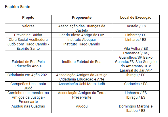 O Instituto EDP, responsável pelas ações socioambientais do Grupo EDP, apoiará 38 projetos em 2021 por meio do seu edital. Ao todo, as instituições apoiadas receberão R$ 7 milhões e devem beneficiar diretamente mais de 73 mil pessoas. No estado do Espírito Santo, 10 projetos foram selecionados. As iniciativas são voltadas para áreas como idosos, saúde, criança e adolescente e esporte. Os projetos estão sediados ainda nos estados de São Paulo, Amapá, Tocantins, Rio Grande do Sul e Ceará.