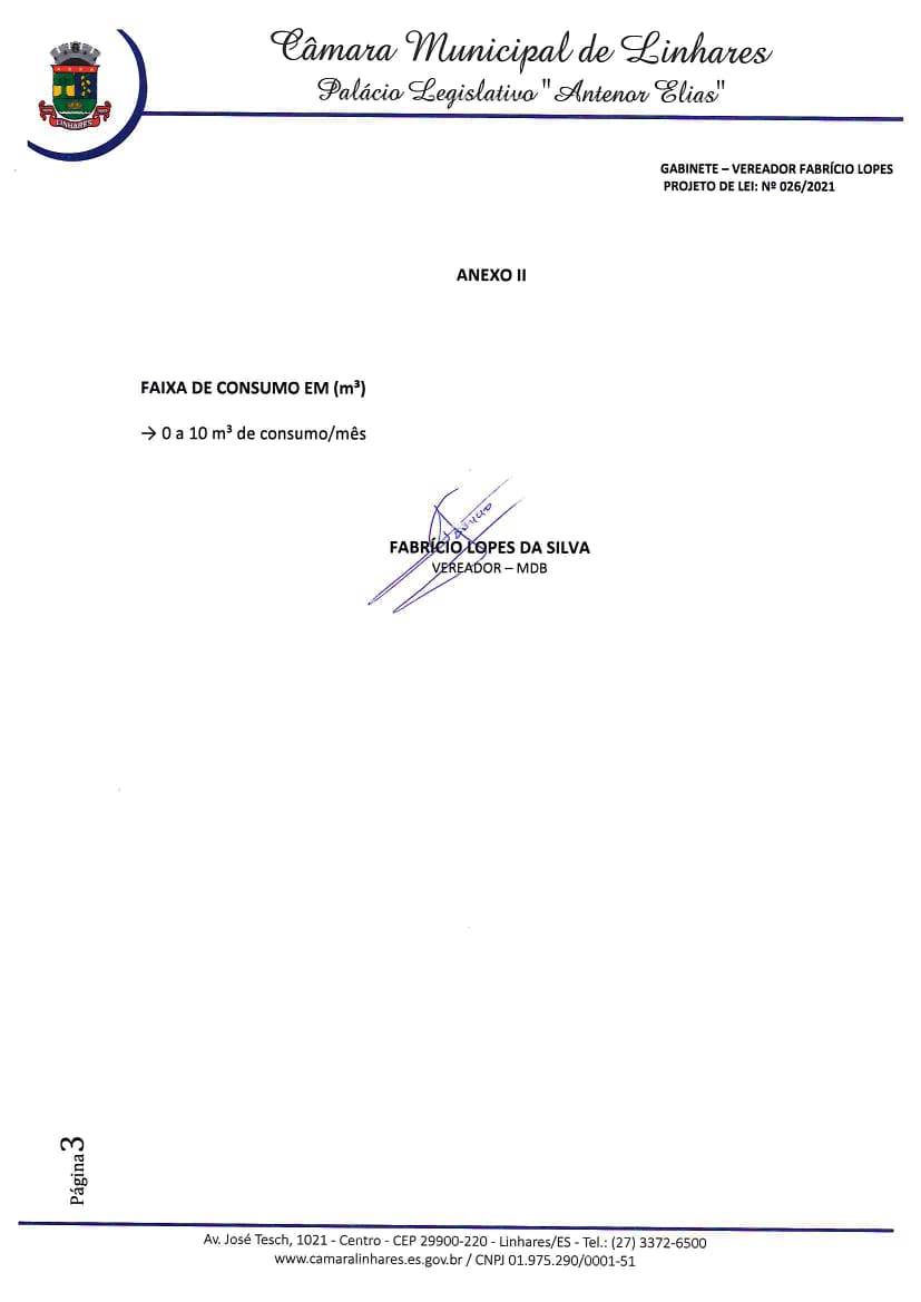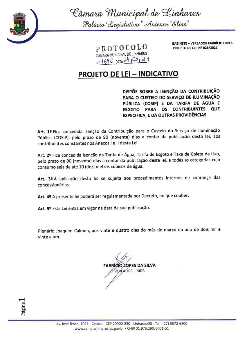 O projeto de lei n.º 26/2021 de autoria do vereador Fabrício Lopes (MDB), dispõe sobre a isenção das tarifas dos serviços de iluminação pública, água e esgoto.