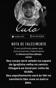 Conforme a nota de falecimento, o corpo de Denerval Carvalhaes Júnior será velado na capela da Igrejinha Velha, no Centro de Linhares, com chegada prevista para 13h30.