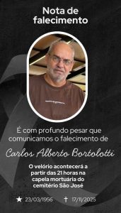 Faleceu na tarde desta segunda-feira (17/11), por volta das 13 horas, Carlos Alberto Bortolotti, aos 69 anos. Ele estava internado no Hospital Geral de Linhares (HGL), onde recebia cuidados médicos.