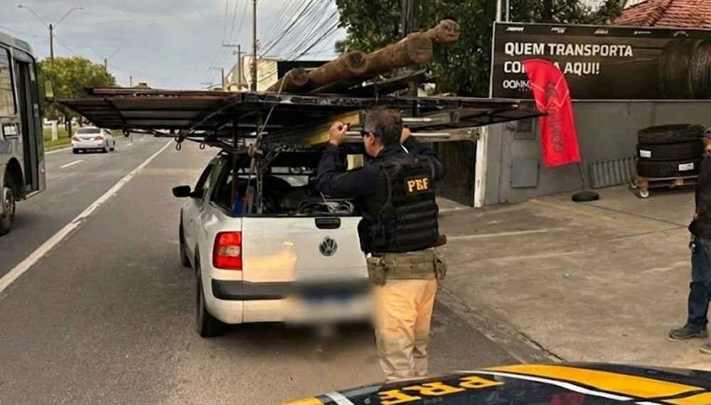 Durante fiscalização, os policiais visualizaram uma caminhonete transportando carga que ultrapassava significativamente os limites da caçamba e da própria faixa de rolamento. A largura da carga era de 3,57 metros, enquanto a faixa de rolamento no local possui 2,80 metros, o que obrigava o veículo a ocupar duas faixas de trânsito, gerando risco à segurança viária.