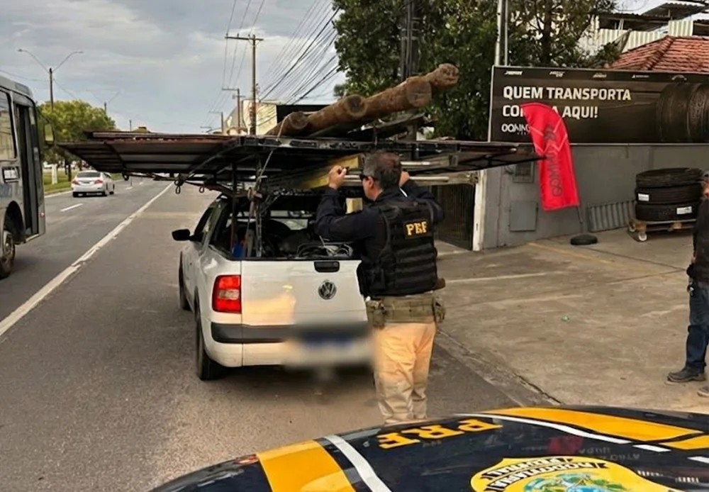 Durante fiscalização, os policiais visualizaram uma caminhonete transportando carga que ultrapassava significativamente os limites da caçamba e da própria faixa de rolamento. A largura da carga era de 3,57 metros, enquanto a faixa de rolamento no local possui 2,80 metros, o que obrigava o veículo a ocupar duas faixas de trânsito, gerando risco à segurança viária.