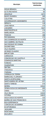 Veja a tabela com o quantitativo de doses distribuídas até o momento aos municípios.