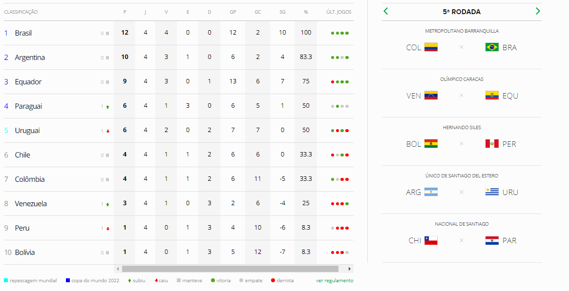 Após quatro (de 18) rodadas, o Brasil lidera com 12 pontos, 100% de aproveitamento. Em março, a seleção jogaria contra a Colômbia em Barranquilla e contra a Argentina no Recife.