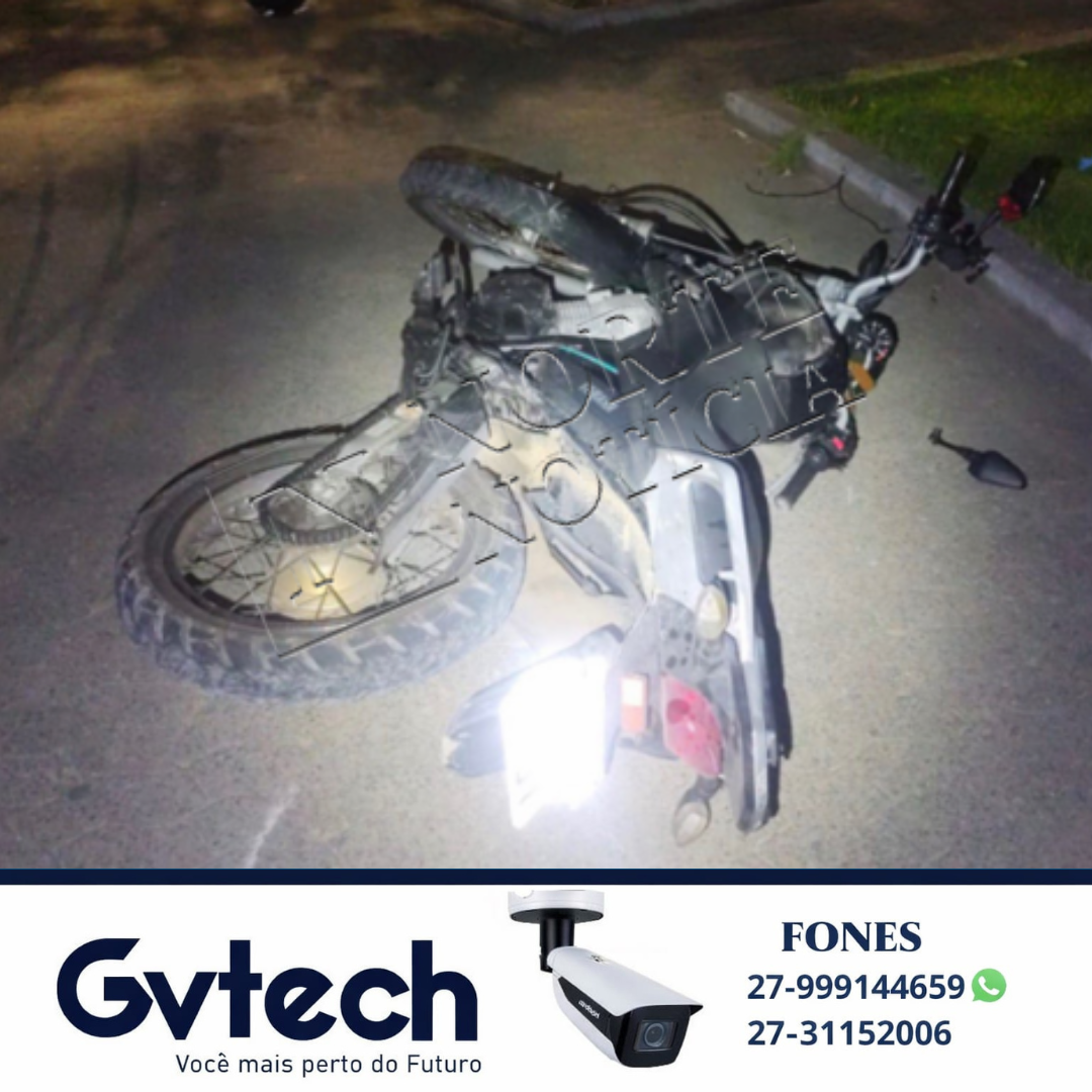 Ao atravessar em alta velocidade o canteiro da Praça 22 de Agosto, no Centro, a motocicleta colidiu contra a proteção do lago. Com o impacto, o passageiro caiu ao solo, aparentemente desacordado. O condutor fugiu a pé, mantendo a mão na cintura.