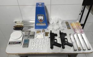 No interior do imóvel, os militares apreenderam duas submetralhadoras calibre .380, munições, balanças de precisão, drogas como cocaína e crack, além de material para embalo, facas utilizadas no fracionamento dos entorpecentes e dinheiro em espécie.