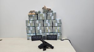 A ação ocorreu no momento exato em que a equipe observou um dos investigados, apontado como possível “laranja” do esquema criminoso, dividindo o dinheiro com outros envolvidos. Além do montante milionário, os agentes apreenderam uma pistola calibre 9mm e munições.