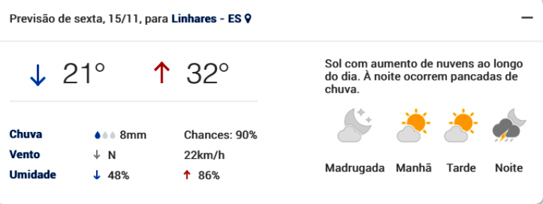 Em Linhares a previsão de chova é de 90%, porém podendo chover 8 mm Veja o quadro abaixo: