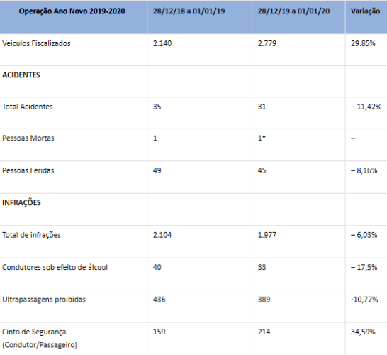 Durante a Operação Ano Novo, notou-se uma diminuição na quantidade de acidentes em relação ao quantitativo do ano passado (2018-2019), sendo 31 acidentes neste ano, contra 35 no ano anterior, representando uma diminuição de 11,42%. No que diz respeito ao número de feridos, também foi observado uma diminuição quando comparado ao ano anterior, sendo 49 em 2018/2019, para 45 neste ano. Ficou inalterado o número de óbitos nas rodovias do Espírito Santo, sendo 1 para cada ano. Neste ano, ocorreu uma morte não instantânea, ou seja, a vítima veio a óbito posteriormente, dentro de uma unidade hospitalar.*