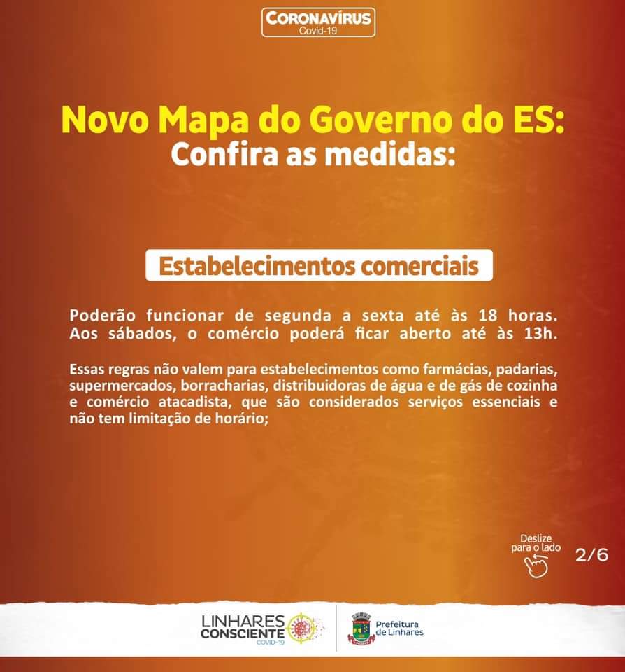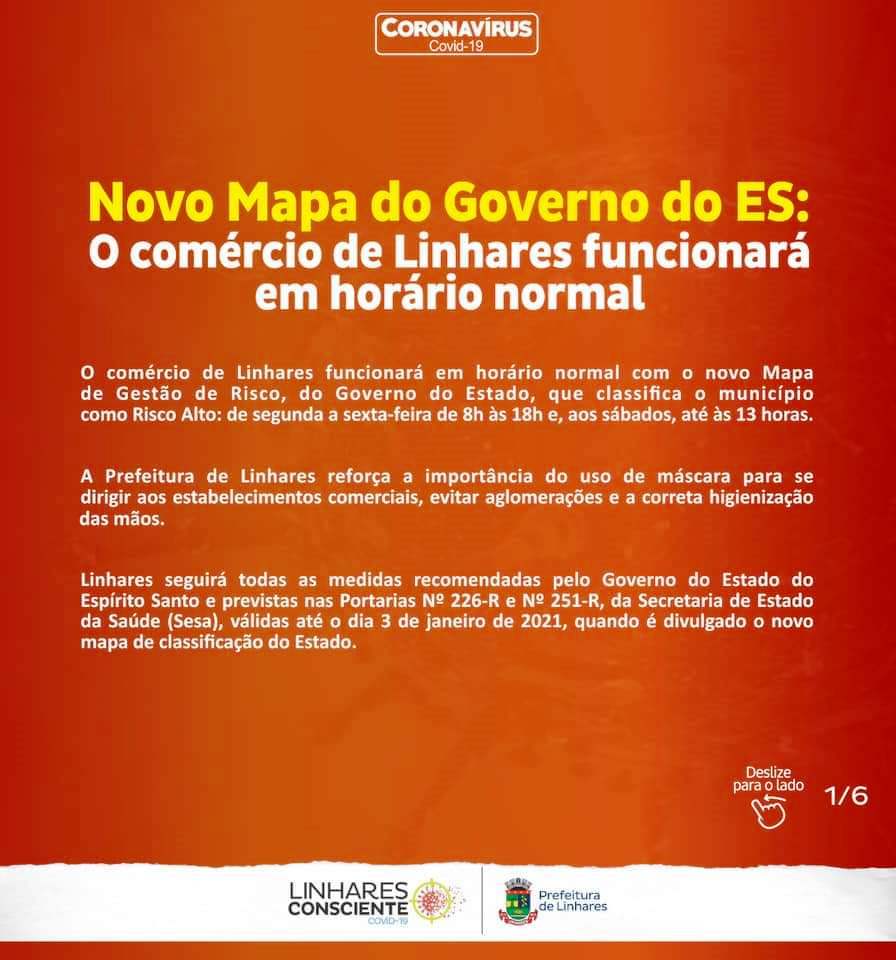 O comércio de Linhares funcionará em horário normal com o novo Mapa de Gestão de Risco que classifica o município como Risco Alto, das 8h às 18h de segunda a sexta-feira, e, aos sábados, até às 13 horas. O horário está alinhado à Portaria 251-R, do Governo do Estado, que determina que os Estabelecimentos Comerciais funcionem de segunda a sexta-feira até às 20h e, aos sábados, até às 16h.
