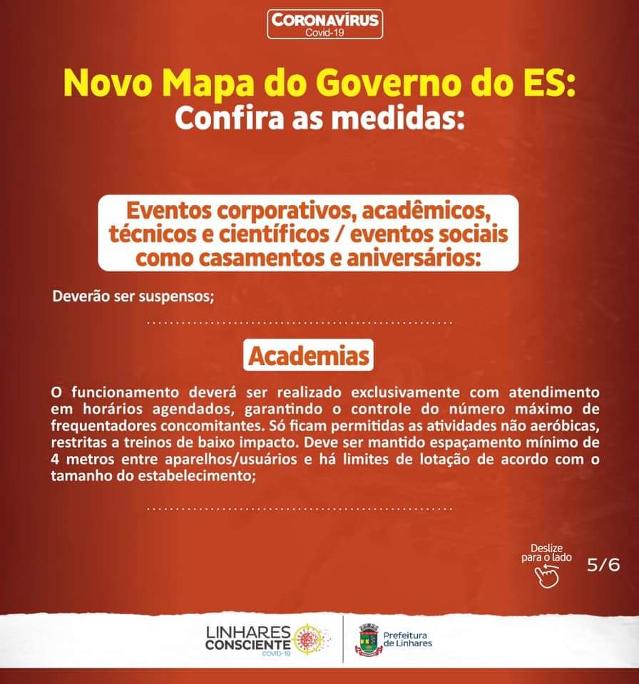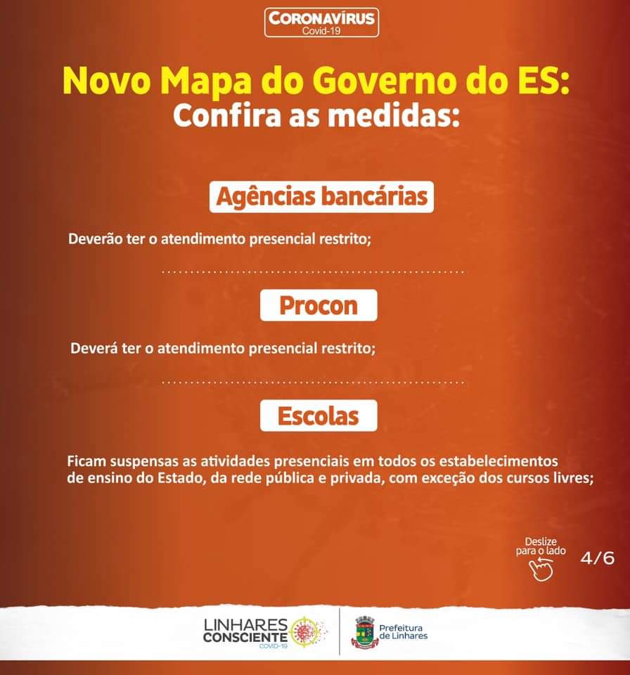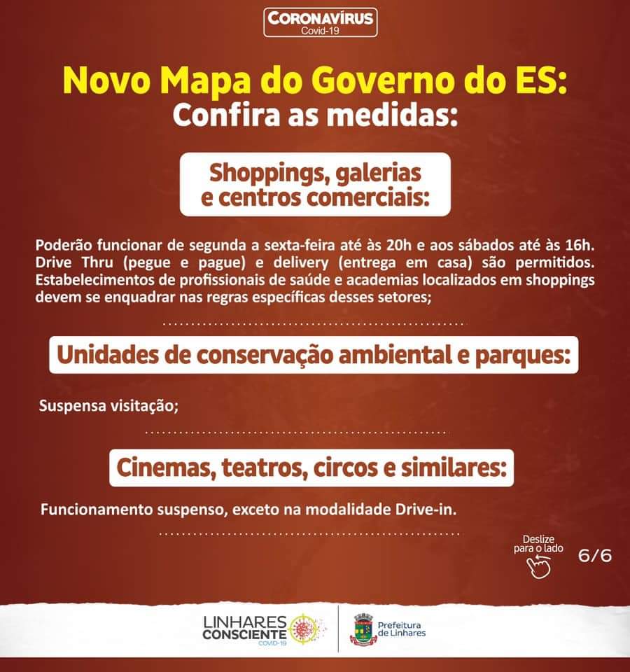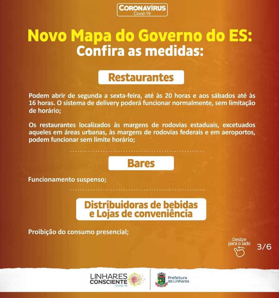 Linhares seguirá todas as medidas recomendadas pelo Governo do Estado do Espírito Santo e previstas nas Portarias Nº 226-R e Nº 251-R, da Secretaria de Estado da Saúde (Sesa), válidas até o dia 3 de janeiro de 2021, quando é divulgado o novo mapa de classificação do Estado.