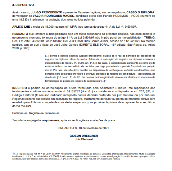 Depois de ouvir diversas pessoas envolvidas na campanha eleitoral do vereador eleito Valdir Maciel (PODEMOS), o Juiz Eleitoral da comarca de Linhares liberou hoje a tão aguardada sentença, sobre o processo que pedia a cassação do diploma do vereador, e por consequência, o afastamento de suas atividades no legislativo. Trata-se de uma ação do Ministério Público Eleitoral, que em investigação apontou atos ilícitos durante a campanha eleitoral em 2020, com oferecimento de vantagens, que caracterizaram compra de votos.