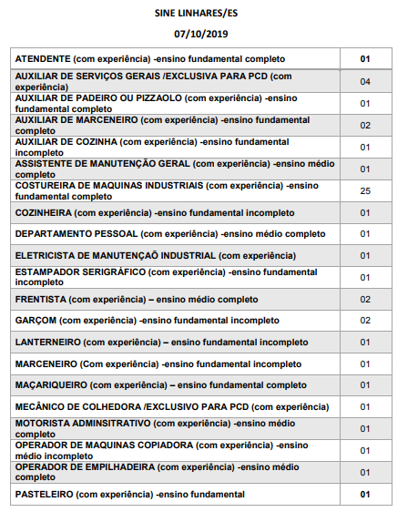 A semana começa no SINE de Linhares com 41 oportunidades de emprego. Há chances para todos os níveis de escolaridade e todas as vagas exige experiência. Confira algumas vagas: frentista, Garçom, cozinheira, Marceneiro, Maçariqueiro ,Auxiliar de Padeiro ou Pizzaiolo, entre outros. O SINE funciona das 8 às 17 horas e os telefones de contato são os 27 3372 2131 e 3372 3230.