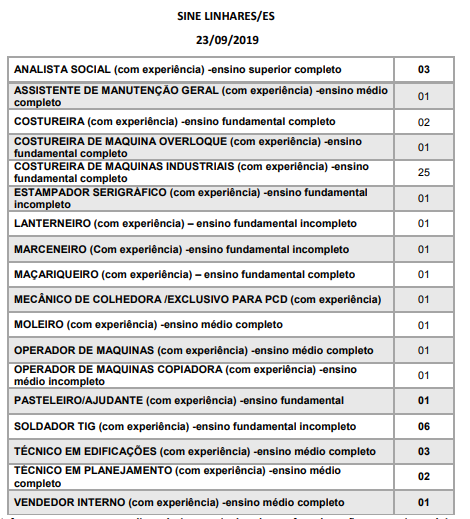 Tags: LinharesSineTrabalhoVagas de trabalho